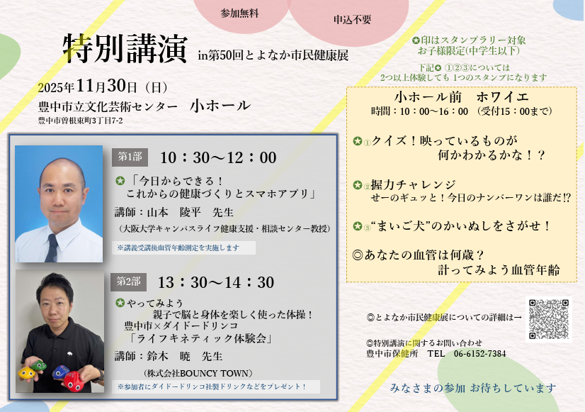 2025年11月30日(日)、豊中市で開催された「第50回 とよなか市民健康展」にて、特別講演として 『親子で脳と身体を楽しく使った体操~ライフキネティック体験会~』の講師を務めさせていただきました。